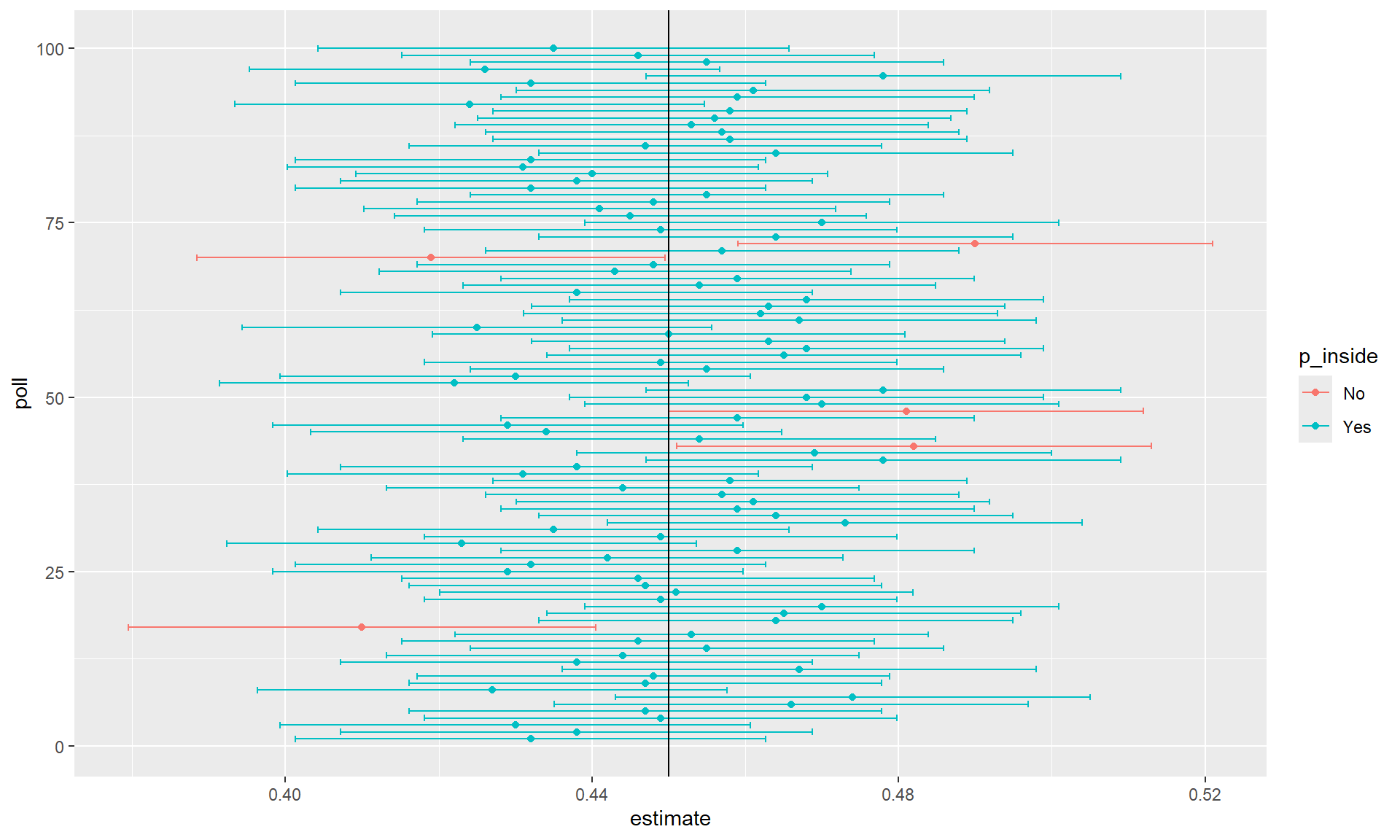 ggplot(tab, aes(poll, estimate, ymin = low, ymax = high, col = p_inside)) +