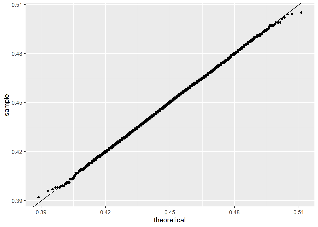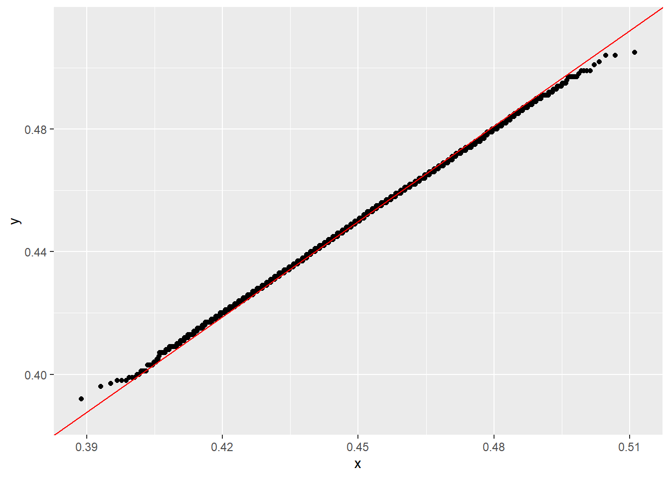 - if you compare your data to the standard normal \(N(0,1)\), the ideal line is only \(y=x\) when your data also have mean 0 and sd 1