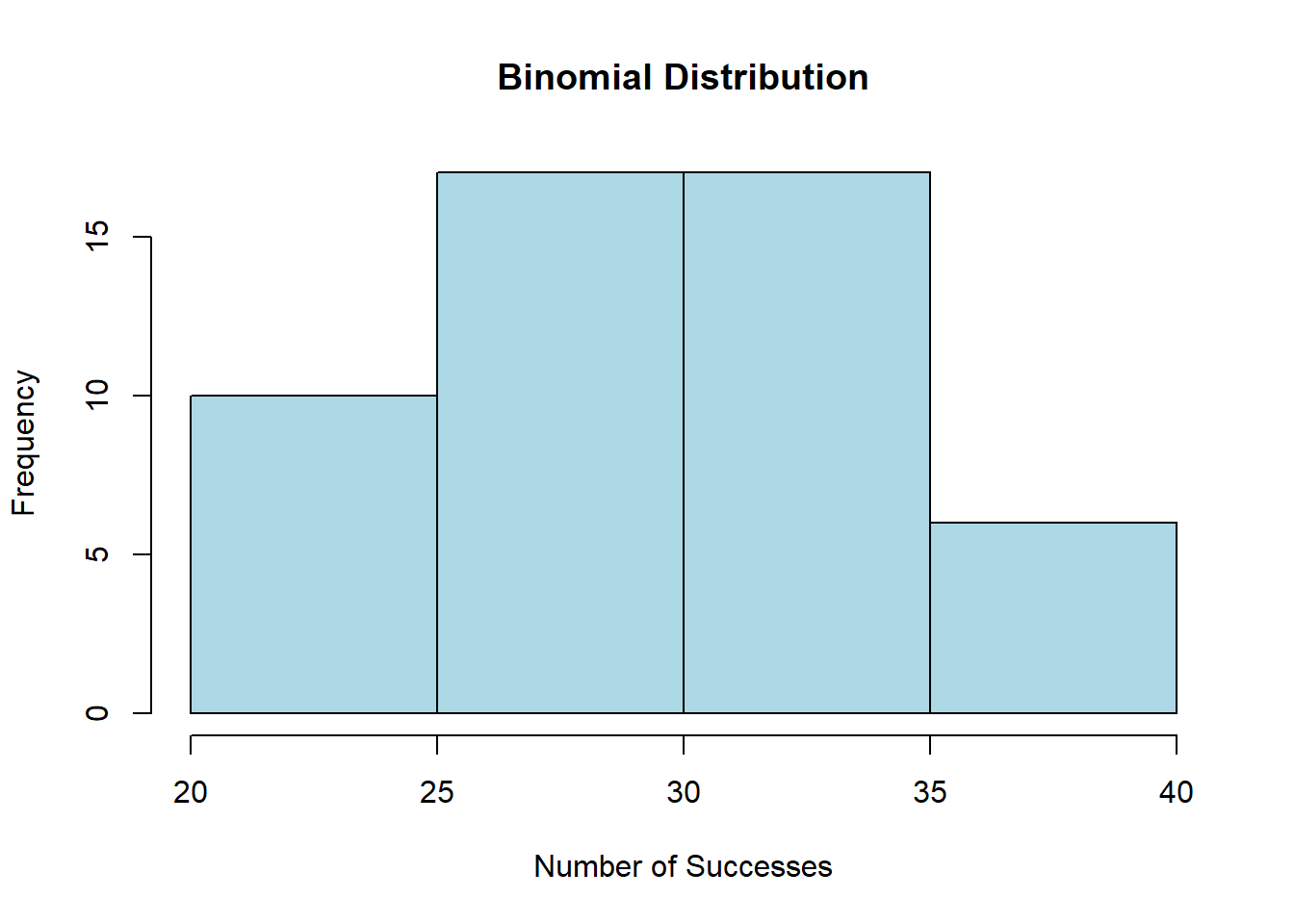 # Create a histogram to visualize the datahist(binomial_data, main ="Binomial Distribution", xlab ="Number of Successes", ylab ="Frequency", col ="lightblue", border ="black")